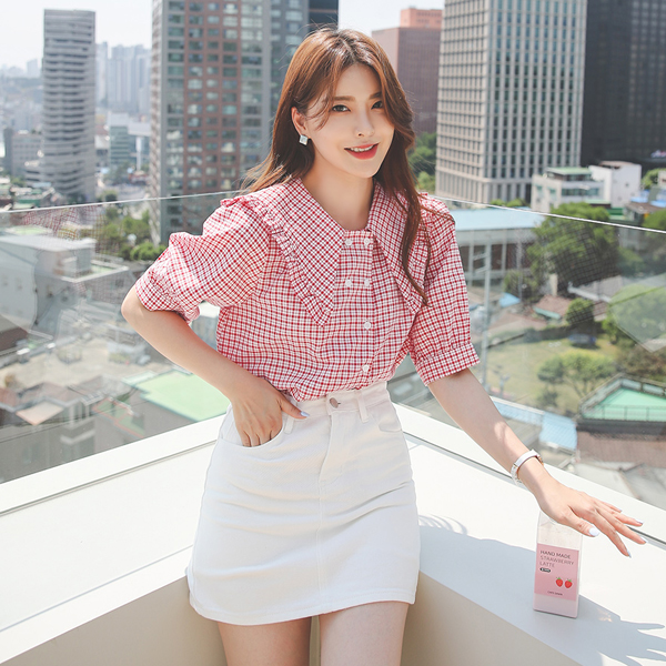 セーラー カラー アンバランス ダブルボタン チェック ブラウス