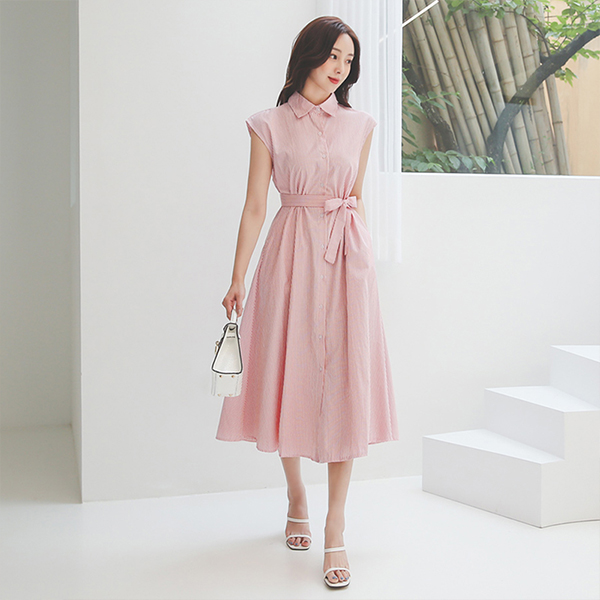 ストライプ フレンチ スリーブ ベルティード ロングシャツ ワンピース