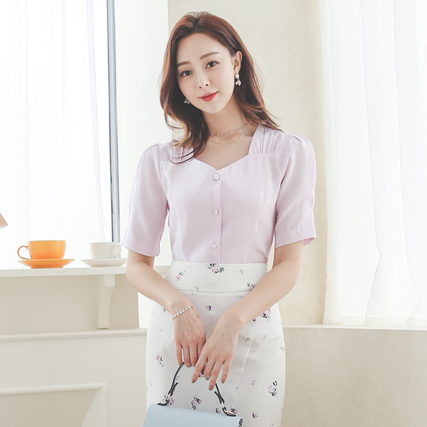 花柄 ボタン シルキー モダール ハートネック ブラウス