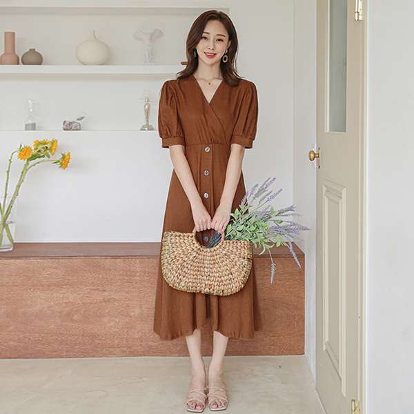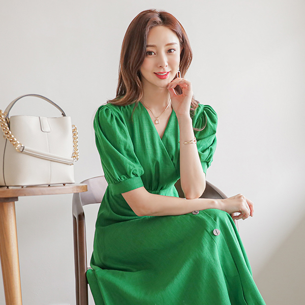 パフ袖 ウッドボタン ラップスタイル フレア ワンピース