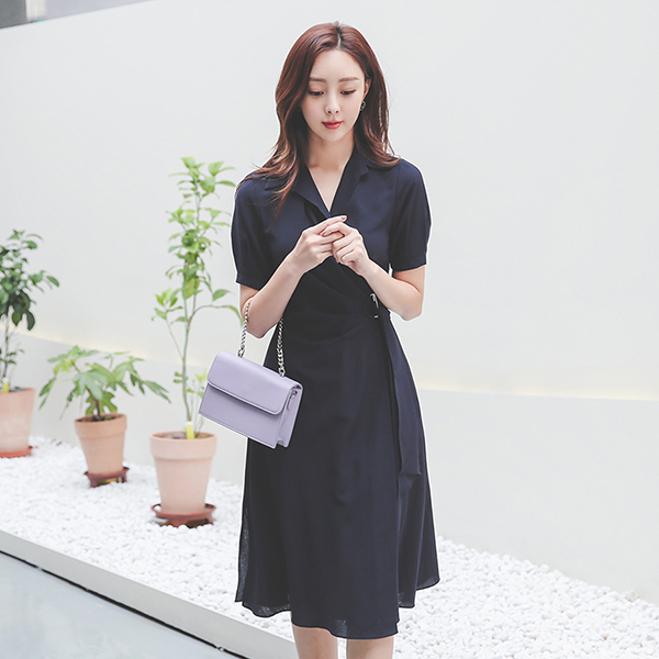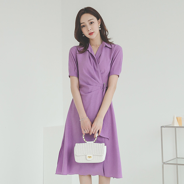 ピンタック Dリングラップ リネン テクスチャ シャツ フレア ワンピース