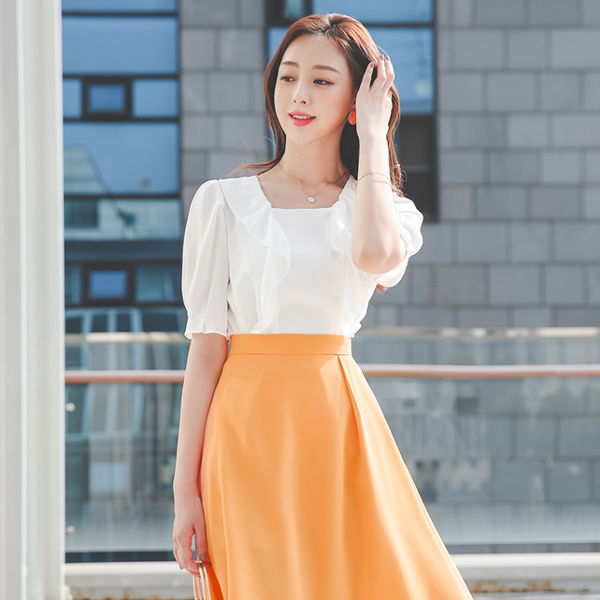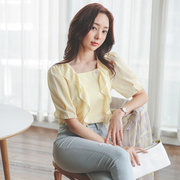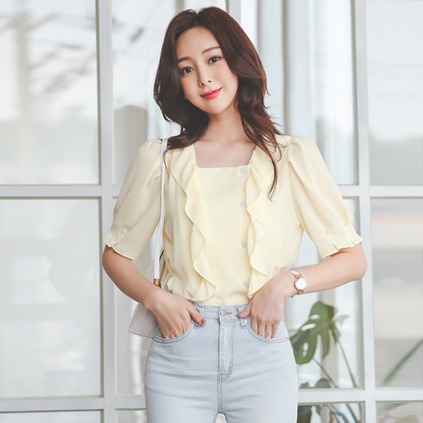 スクエアネック 二重 ラッフル サイド ボタン ブラウス