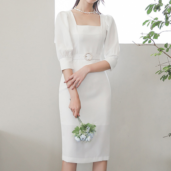 真珠輪 ベルト ディープスクエアネック バルーン袖 弾力 ワンピース