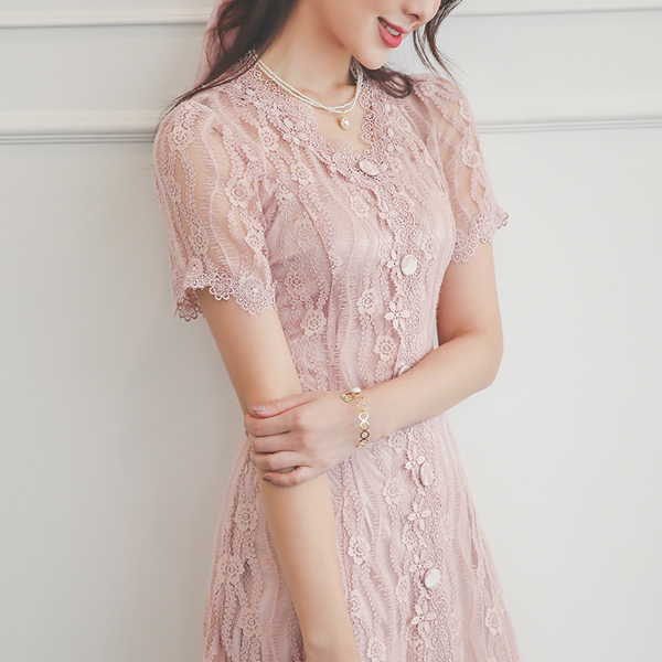 Linne ウエーブ フローラル レイス Aライン ワンピース