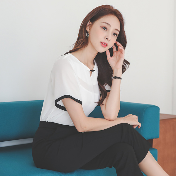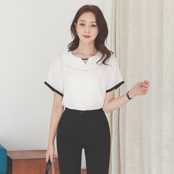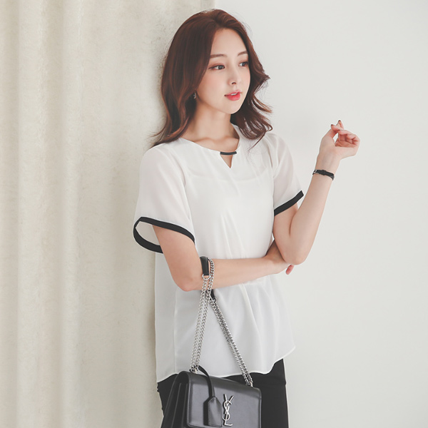 Black ドバー装飾 配色ライン パピヨンスリープ ブラウス