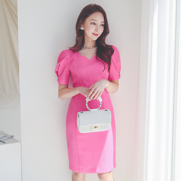 ハートネック ピンタック パフ袖 切開ライン ワンピース