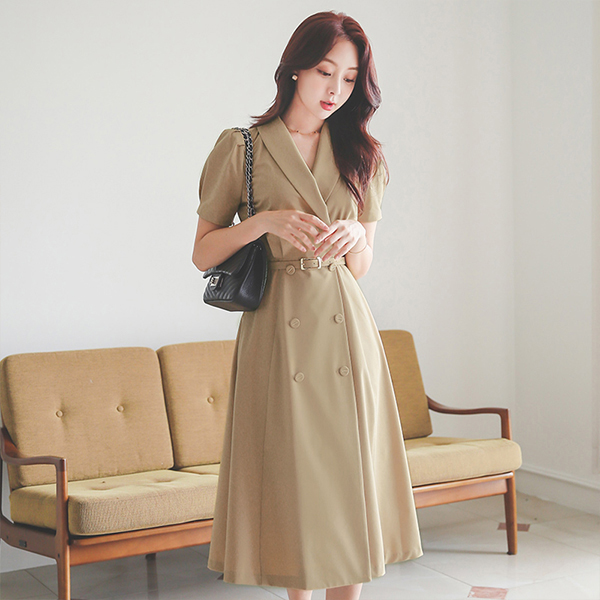 ショールカラー パフ袖 ゴールドバー装飾 ダブル ボタン ワンピース