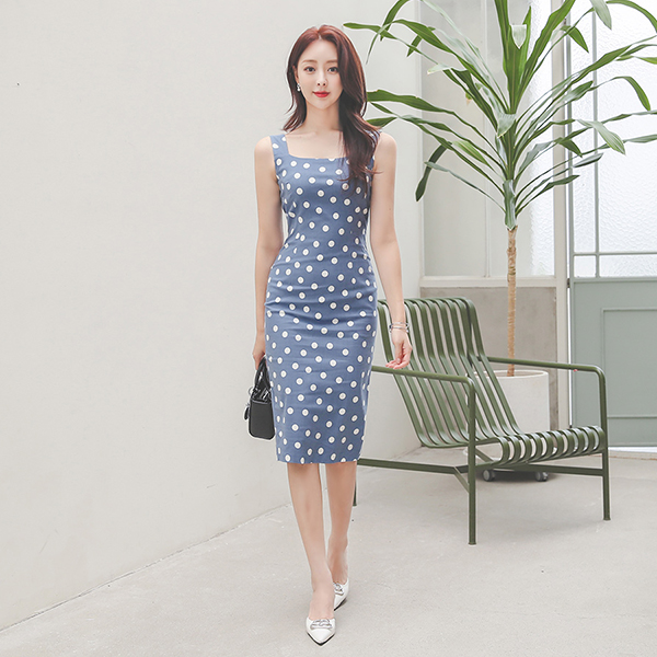 ビッグドット コットンスパンデックス スクエアネック スリーブレス ワンピース