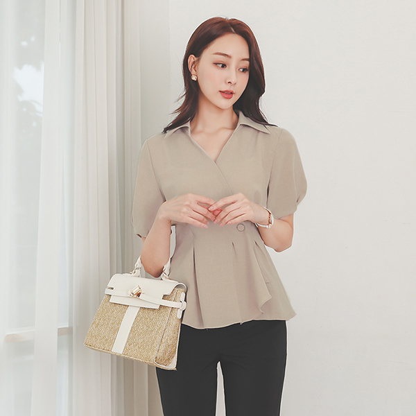 オープンカラー パフ袖 ラップ フレア ブラウス