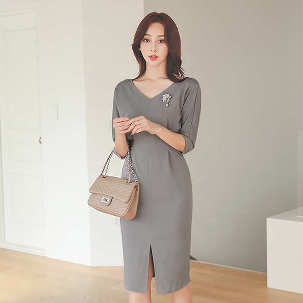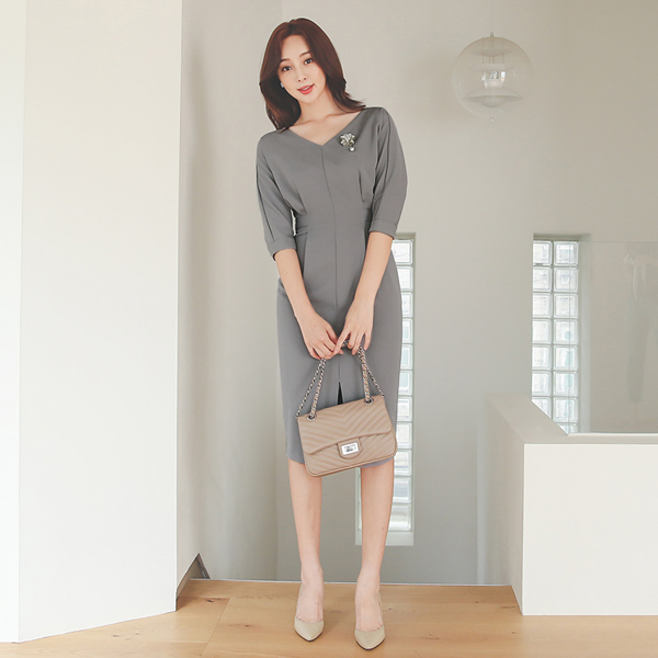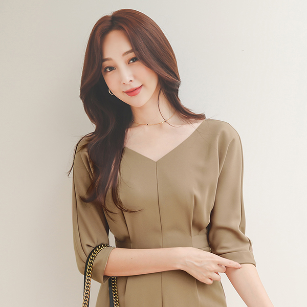 양 ブイネック ピンタックライン ドルマンスリーブ ワンピース