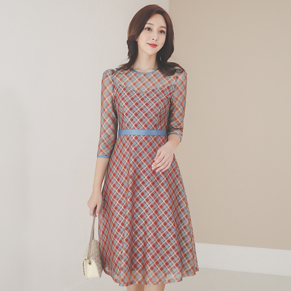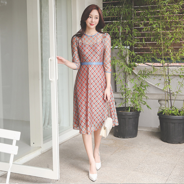 メッシ チェック 繻子 テーピング フレア ワンピース
