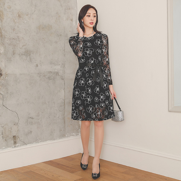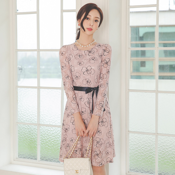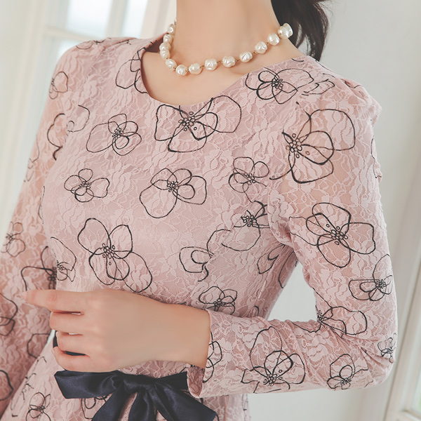 配色 レイス 繻子 リボン フレア ワンピース(長袖)