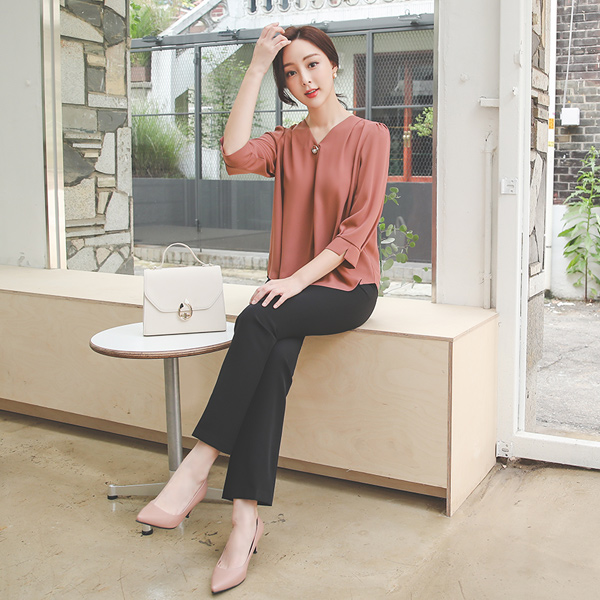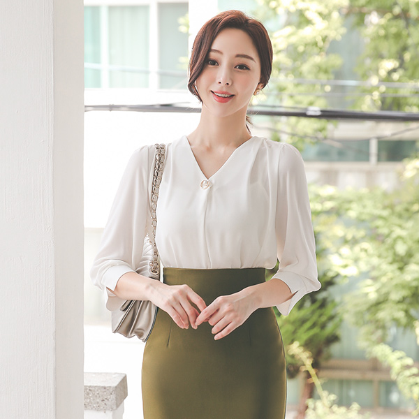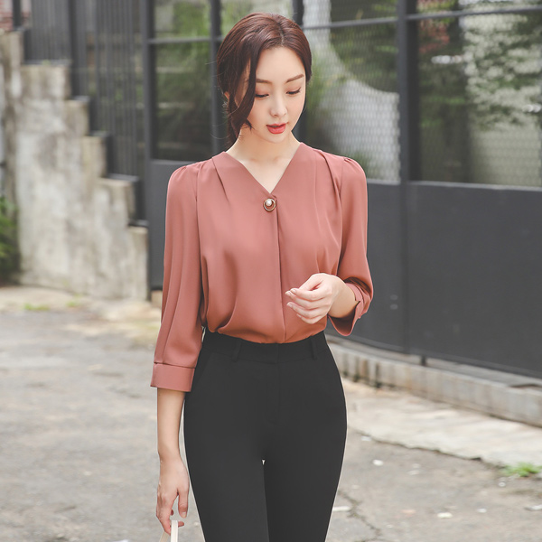ショルダー ピンタック Gold 真珠輪 衣袖开叉 ブラウス