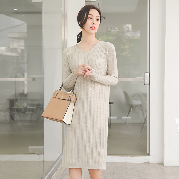 ビスコース スリム ねじる ブイネック ニット ワンピース