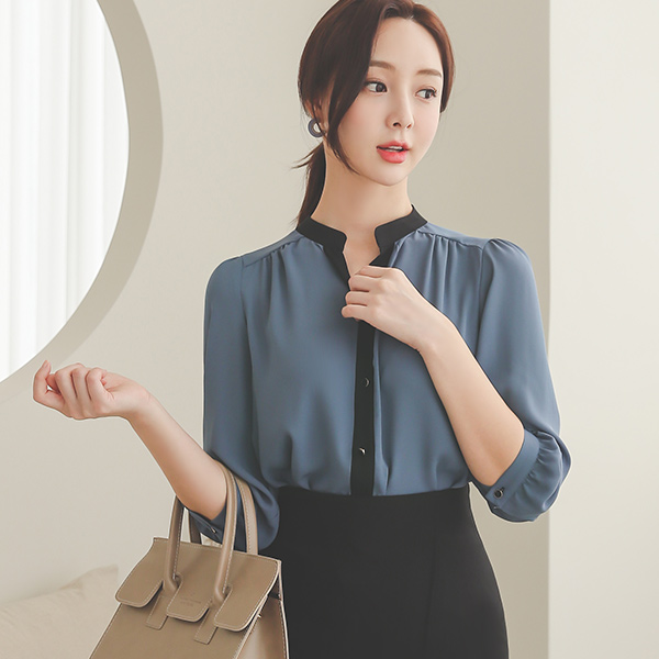 半オープン チャイナ 配色 ギャザーシャーリング ブラウス