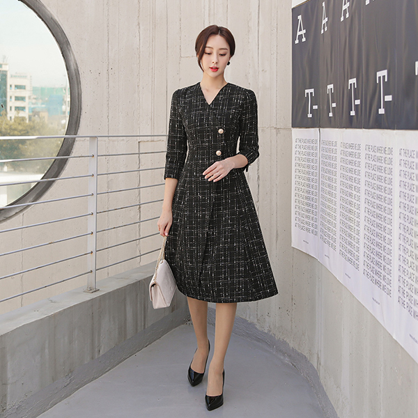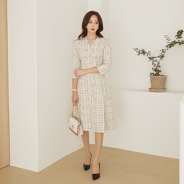 アンデイーグ Gold ボタン ツイード フレア ワンピース