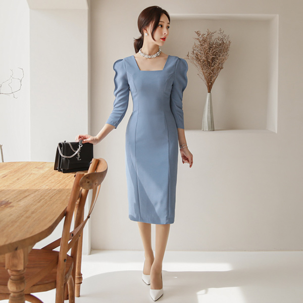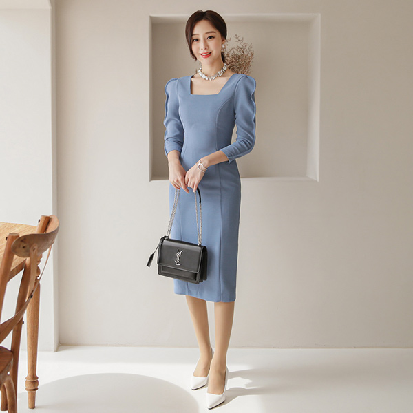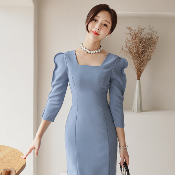 スクエアネック エッジ パフ袖 弾力 ワンピース