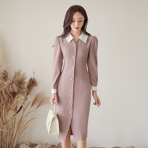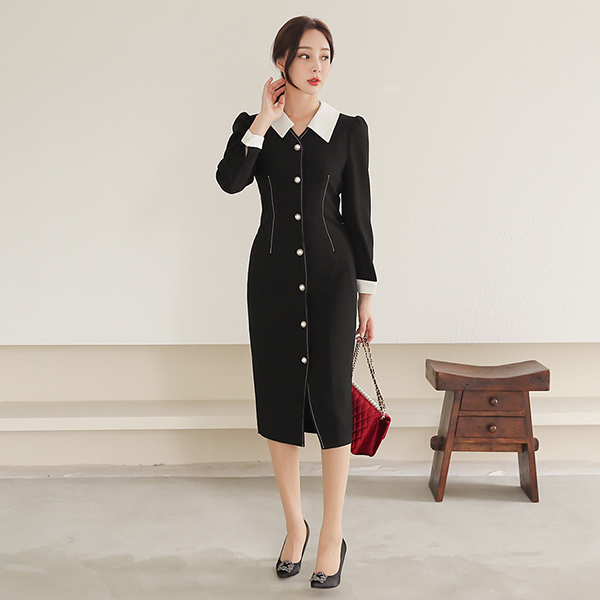 Olivia 真珠ボタン ステッチ 配色 フラットカラー ワンピース