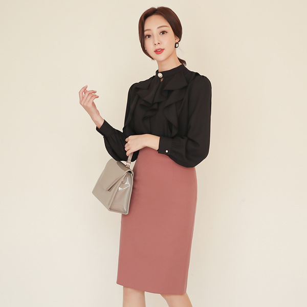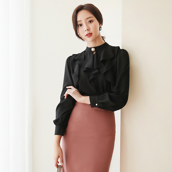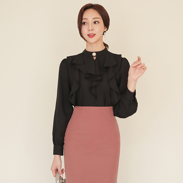 ゴールド真珠 切開ネック ティアード ラッフル ブラウス