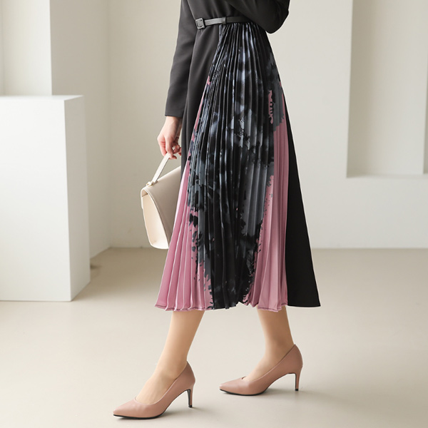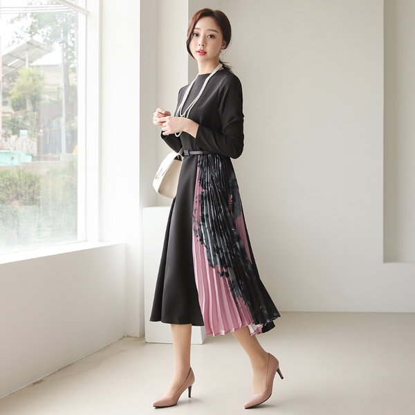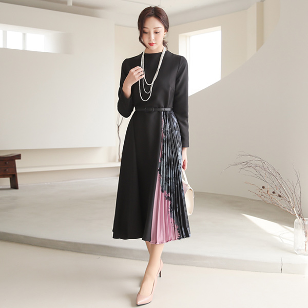 エレガンス サテン プリーツ 配色 漏斗ネック ワンピース