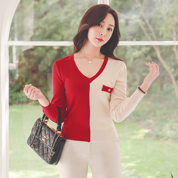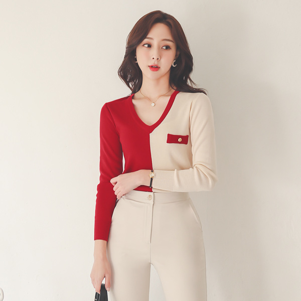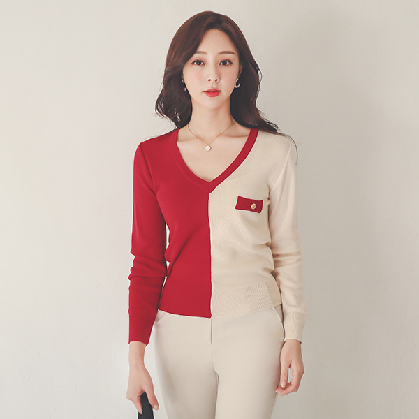 ハーフ 配色 アンデイーグ ボタン ブイネック ニットティーシャツ
