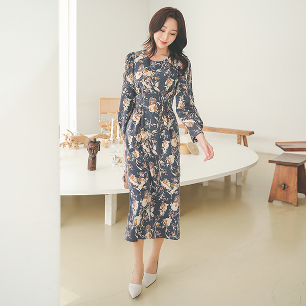 Shady 花柄 Dart Pintuck パフ袖 ロング ワンピース