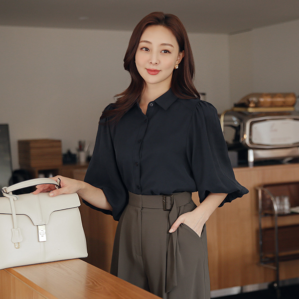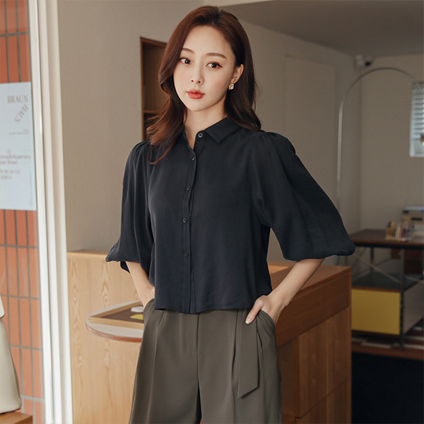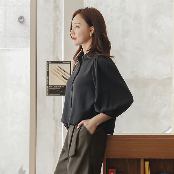 ストリング バルーン袖 シルキー クロップド カラー ブラウス
