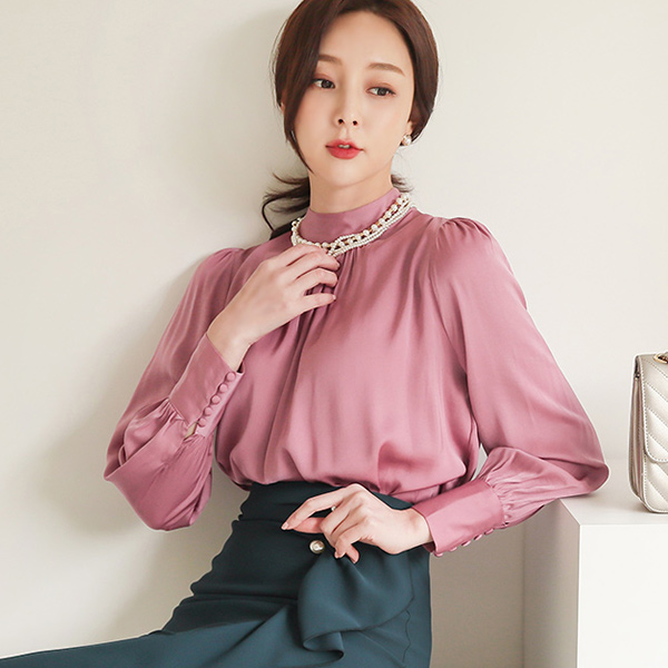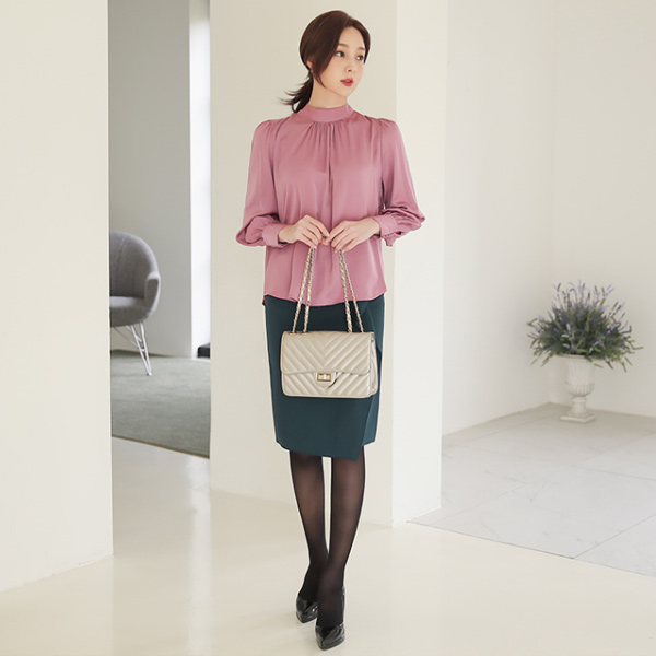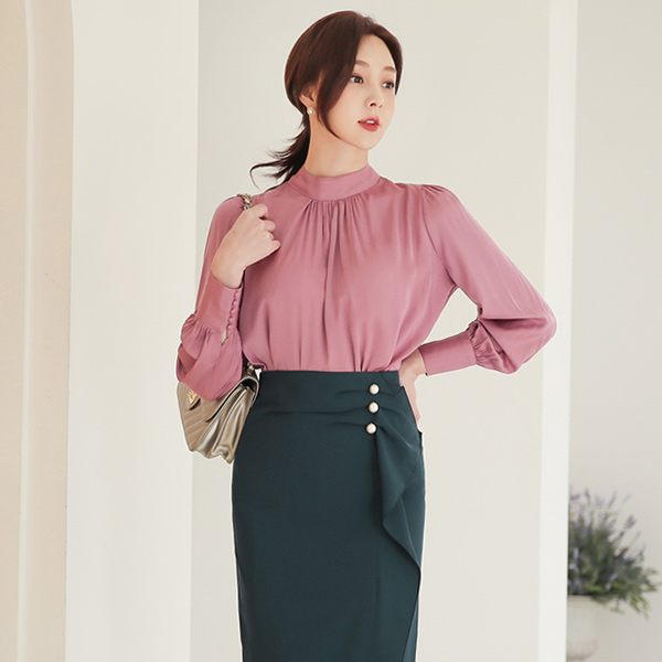 サテン ハイネック シャーリング パフ袖 ブラウス