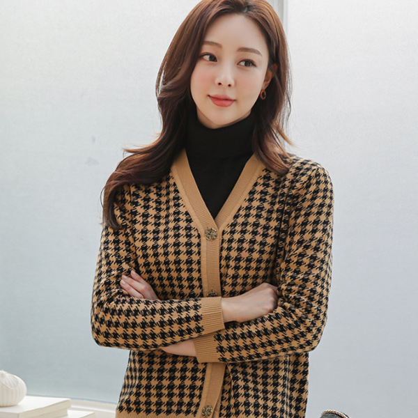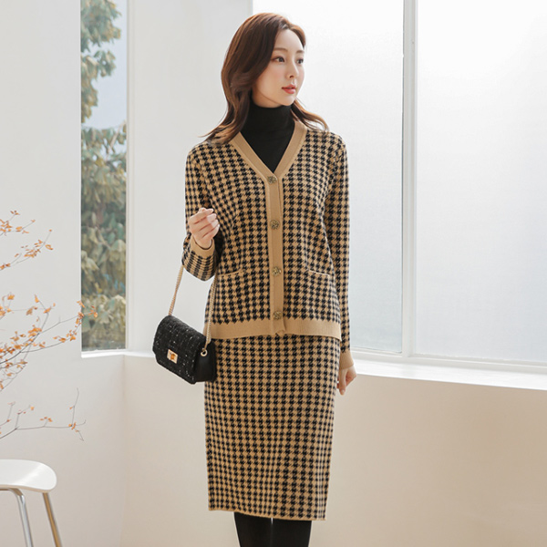 ハウンドトゥース ゴールドボタン ニット カーディガン&スカート SET