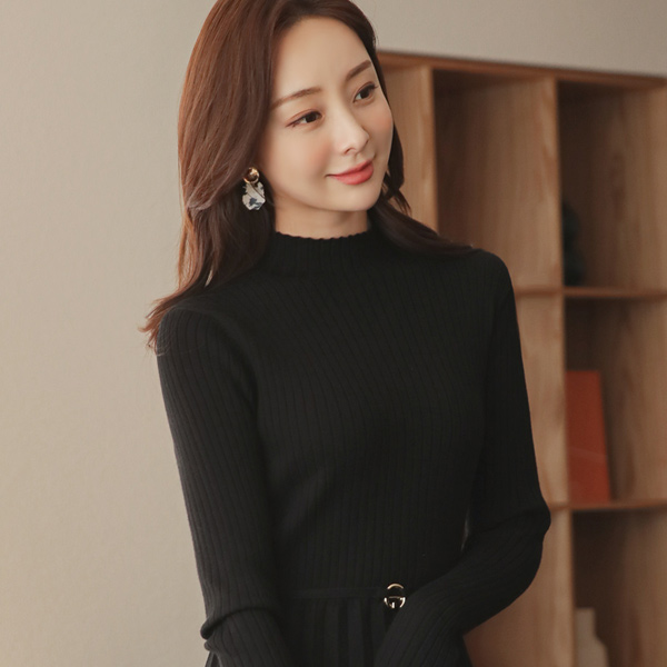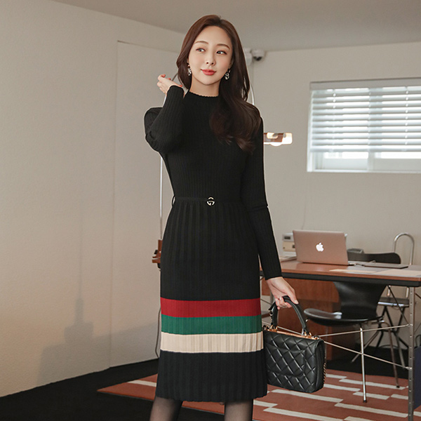 マルチ 配色 ゴールド装飾 ベルティード ニット ワンピース