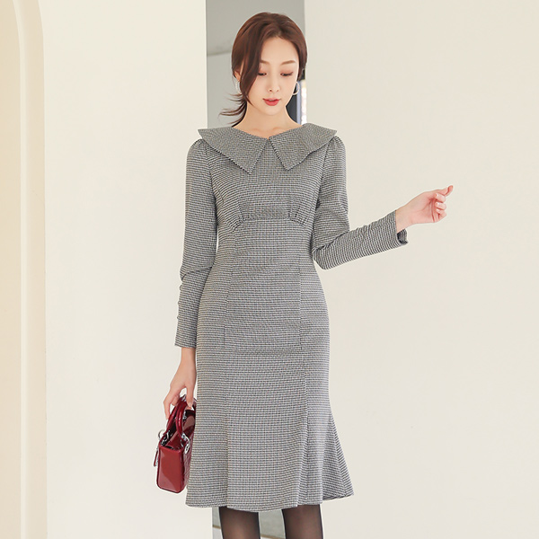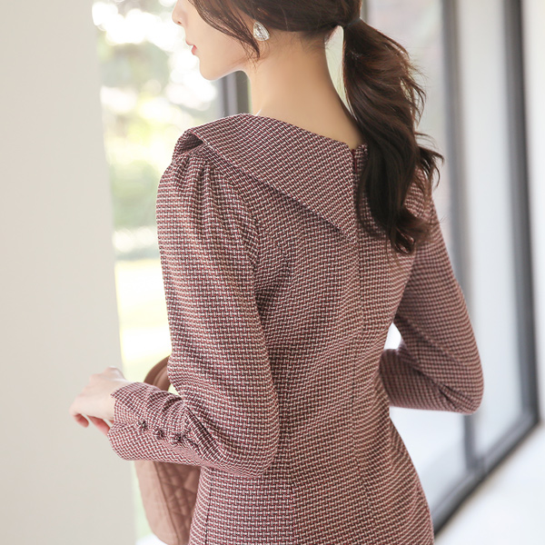 ワイド フラットカラー ピンタック シャーリング ツイード ワンピース