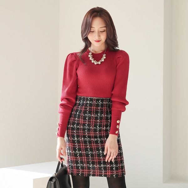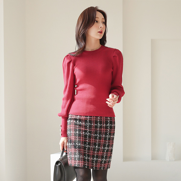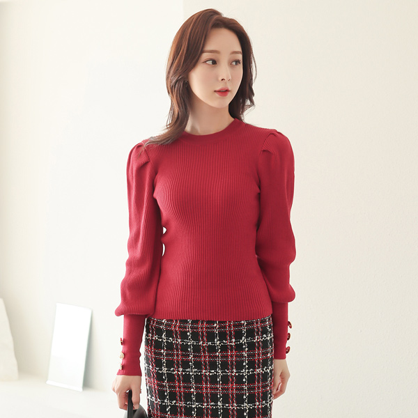 ボールド ゴールドボタン カフス シャーリング パフ袖 ニット