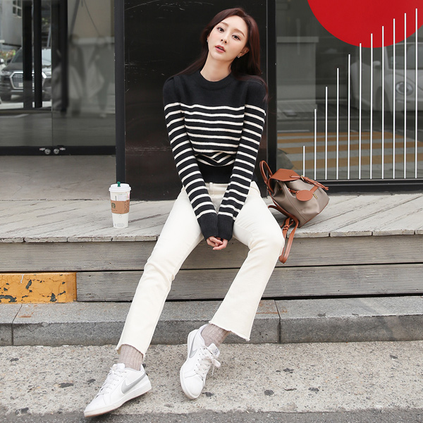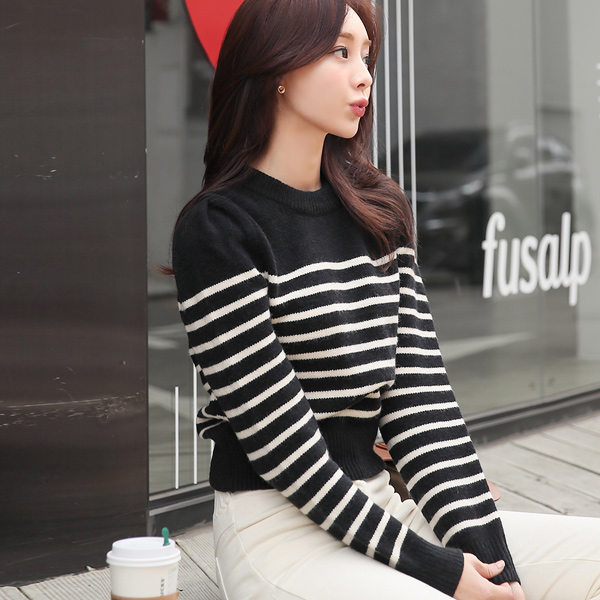配色 ストライプ パフ ウールニット