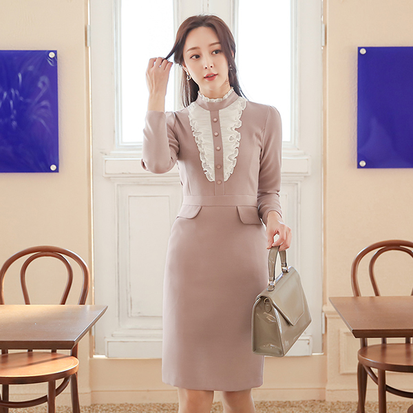 プリーツ フリル トリミング ボタン ハイネック ワンピース