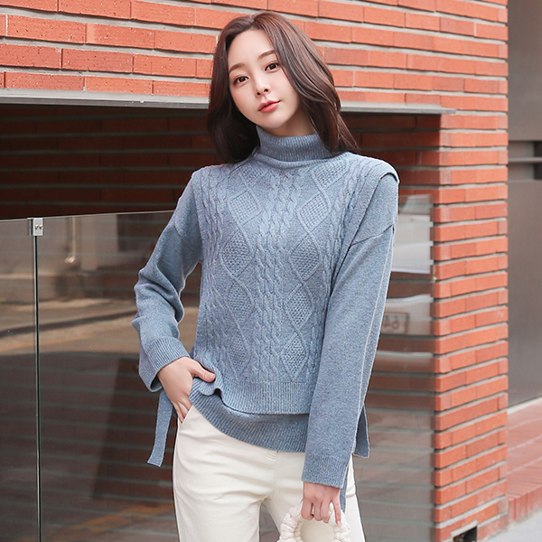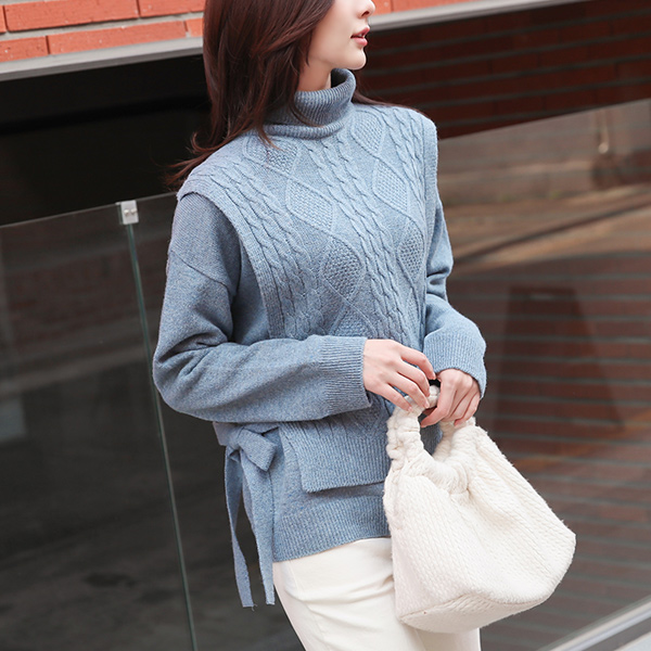 ケーブル リボン ベスト レイヤード タートルネック ニット