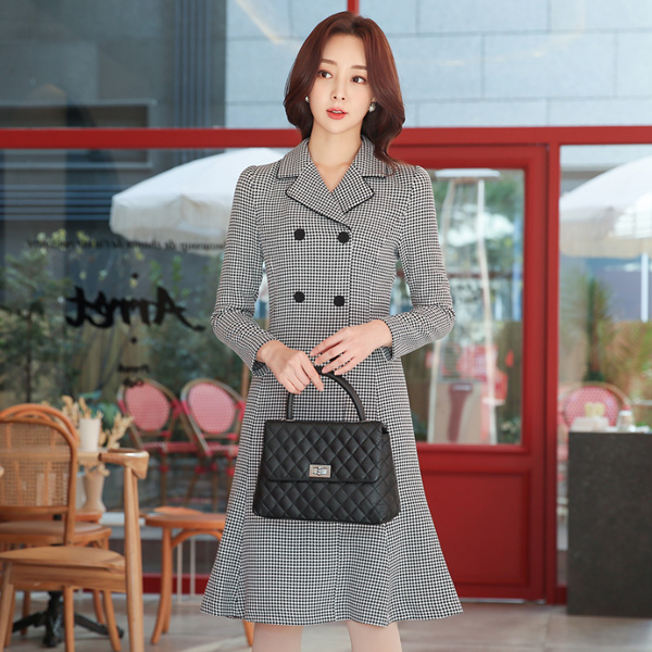 ハウンドトゥース ダブルボタン パイピング カラー ワンピース