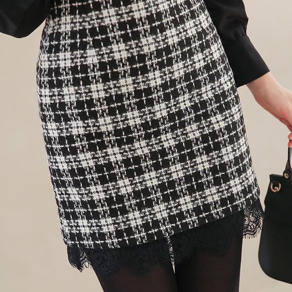 モノチェック ツイード レイス トリミング スカート