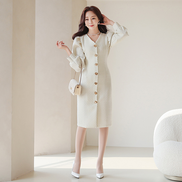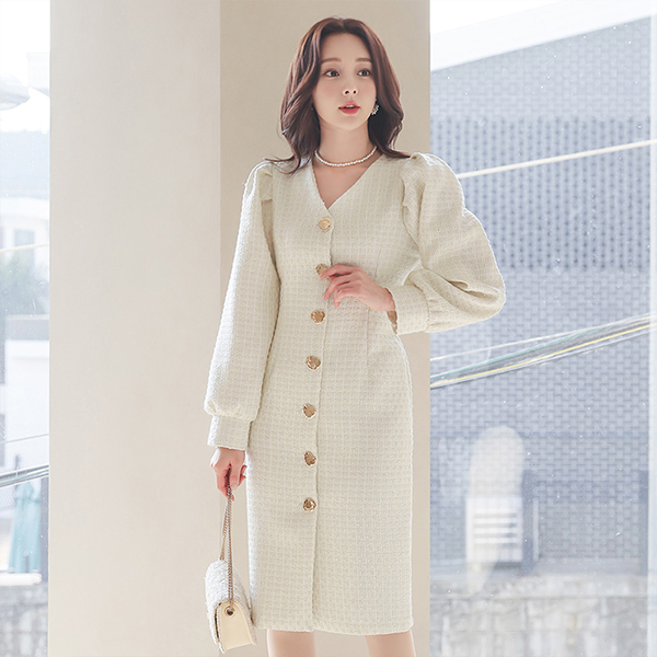 パールツイード バルーン袖 ゴールドボタン ワンピース