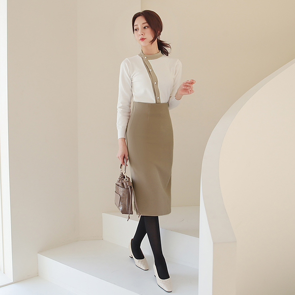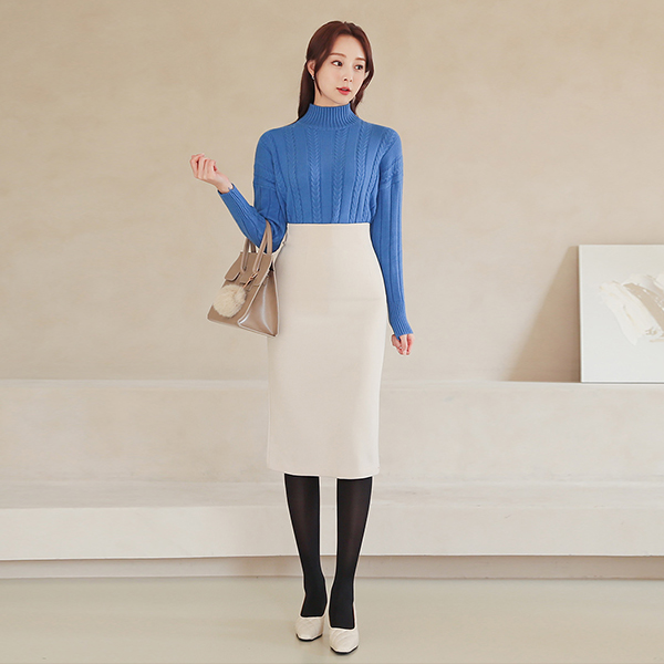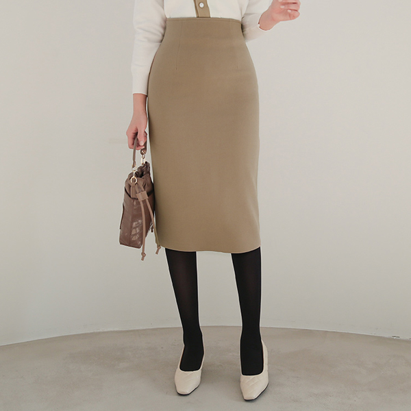 横線スリット ハイウエスト 弾力 スカート(起毛裏地)