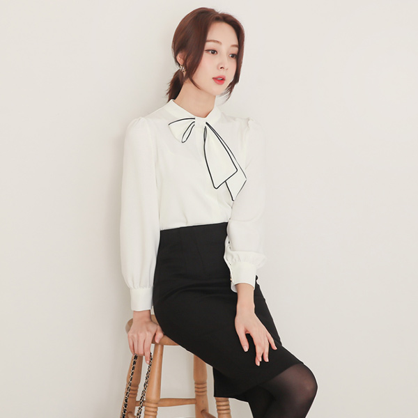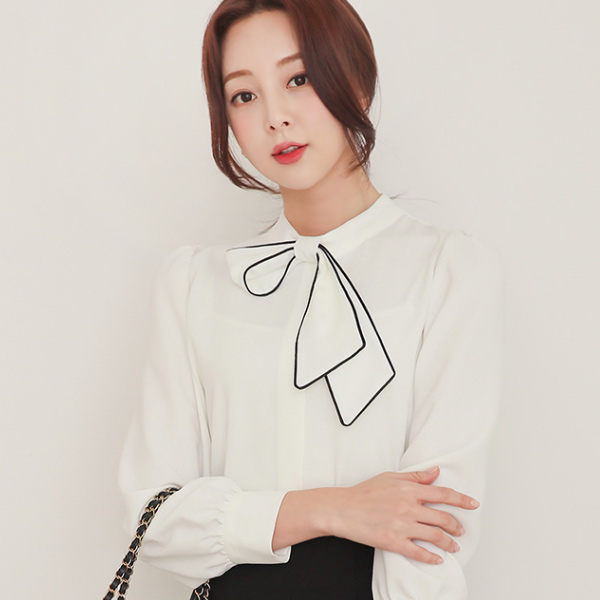 パイピング 配色 アンバランス タイ ハーフネック ブラウス
