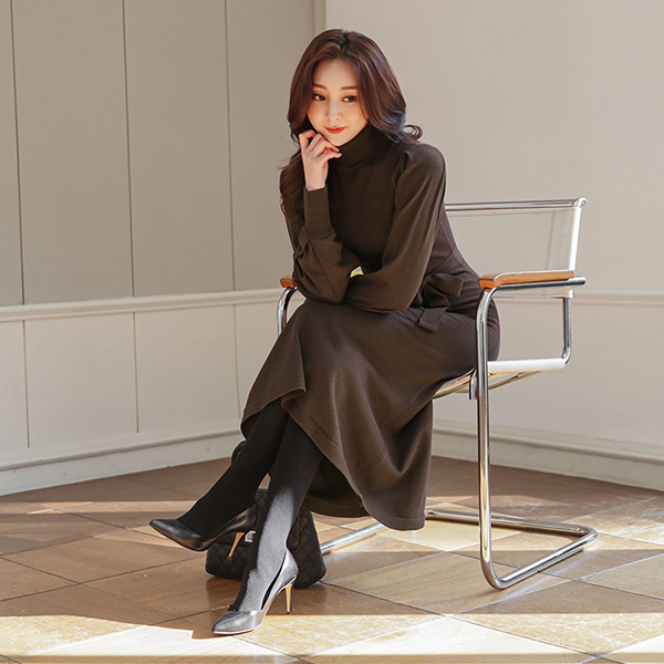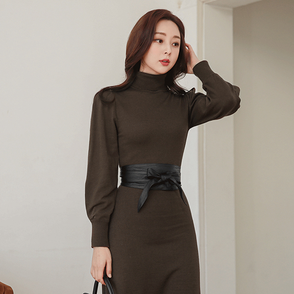 フルライン ピンタック パフ袖 とっくりえり ニット ロングワンピース