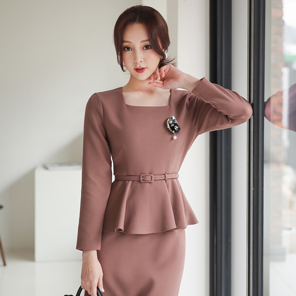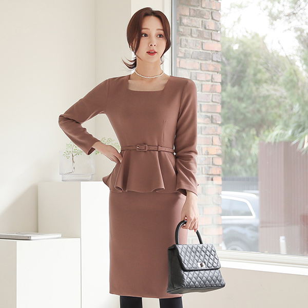 スクエアネック ペプラム ベルティード 弾力 ワンピース