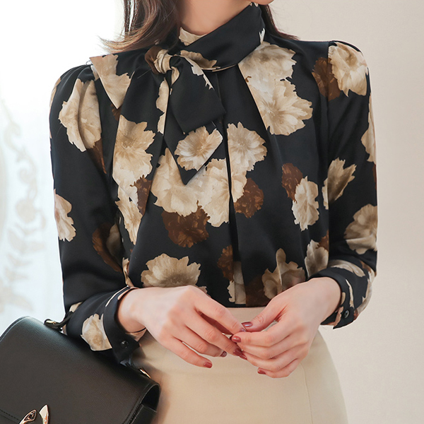シルキー 花柄 ピンタック スカーフネック ブラウス