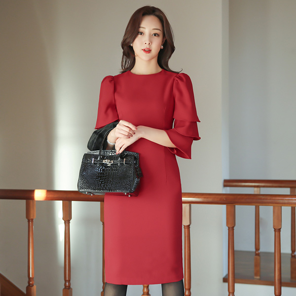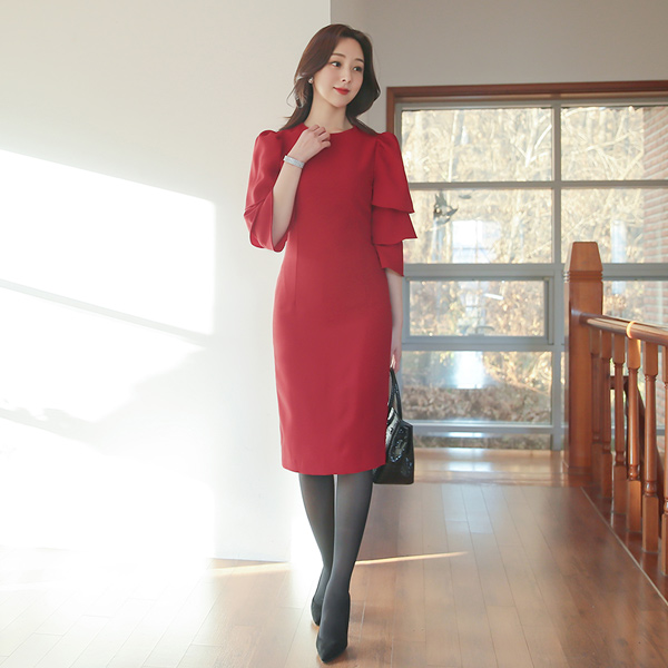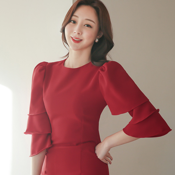 エレガンス ラッフル ティアード スリーブ スリム ワンピース