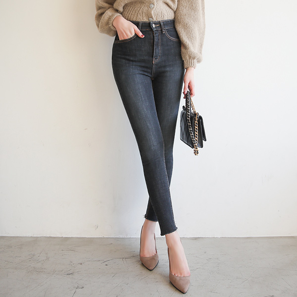 다크워싱 Stretchy-Waist 하이즈라이즈 スキニージン(起毛裏地)