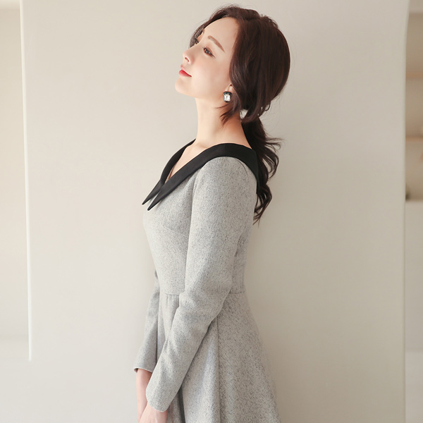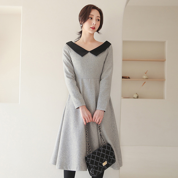 フラットカラー 配色 ふか-Vネック フレア ワンピース