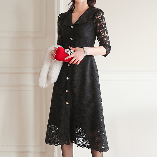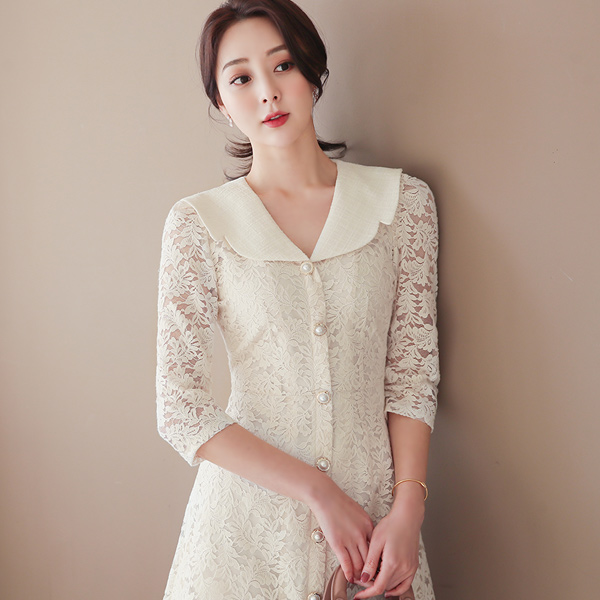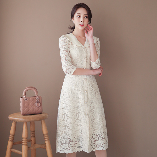 パールツイード セーラーカラー 真珠ボタン レイス ワンピース