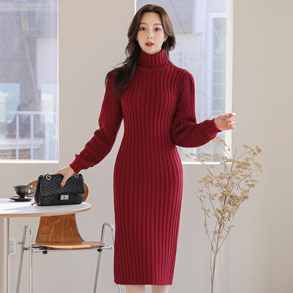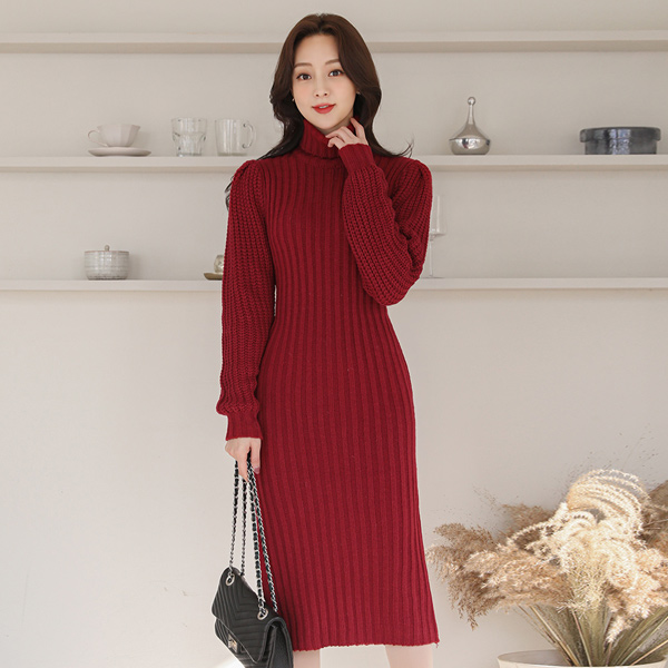 ボールド コール天 タートルネック サイド スリット ニットワンピース