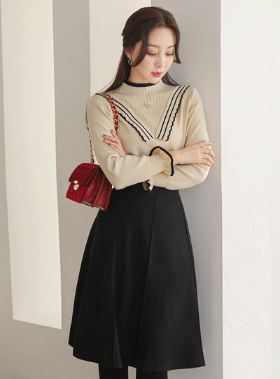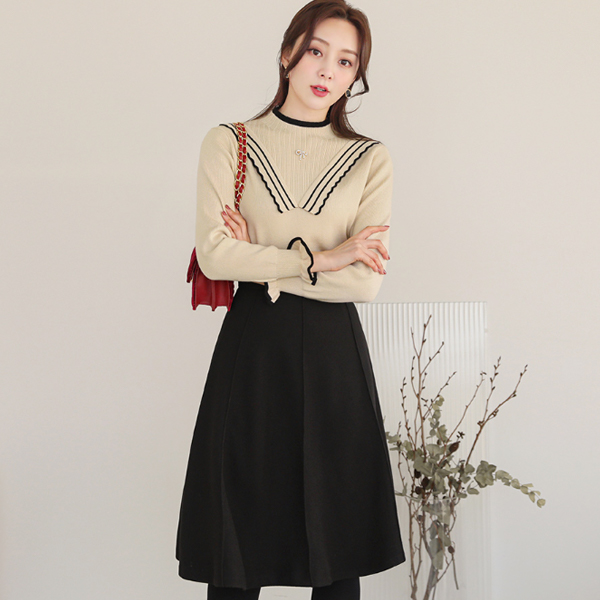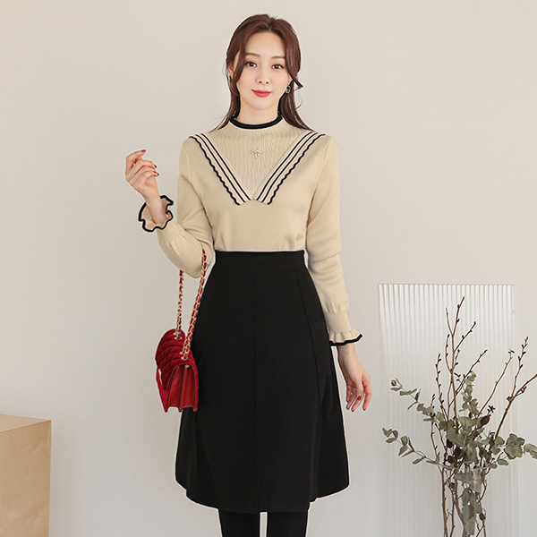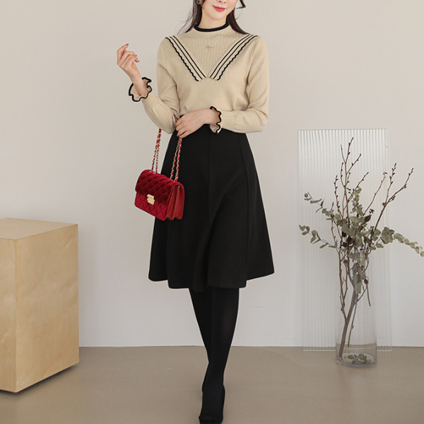 Vフリル 飾り 配色 ブローチ ニットティーシャツ