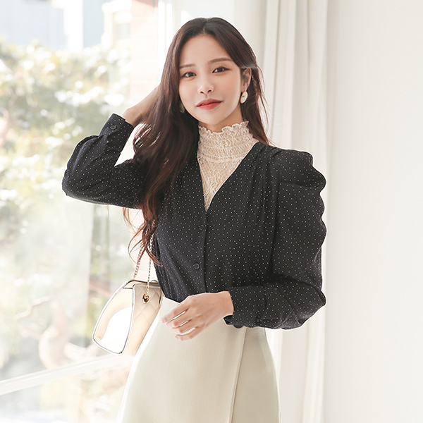 スモック シースルー レイス ハイネック ブラウス